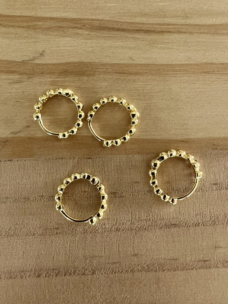 Las Argollas Javiera son la opción perfecta para un look delicado con un toque especial. Su diseño en dorado brillante (enchape de oro 18k) con textura en relieve tipo cuentas refleja luz y movimiento, aportando un estilo femenino, moderno y artesanal.